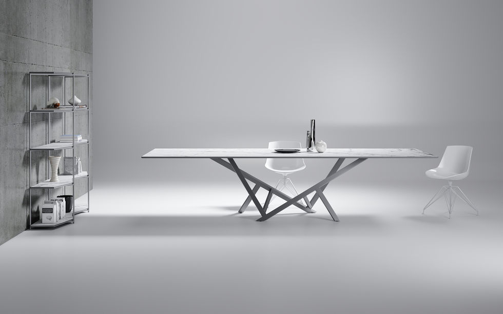 A sophisticated form based on geometric shapes is the hallmark of the NEST table. Its geometric stance, inspired by a bird's nest, consists of rectangular steel strips arranged asymmetrically in a dynamic structure supporting the table top. NEST is a table dedicated to modern and minimalist, as well as loft and industrial interiors.