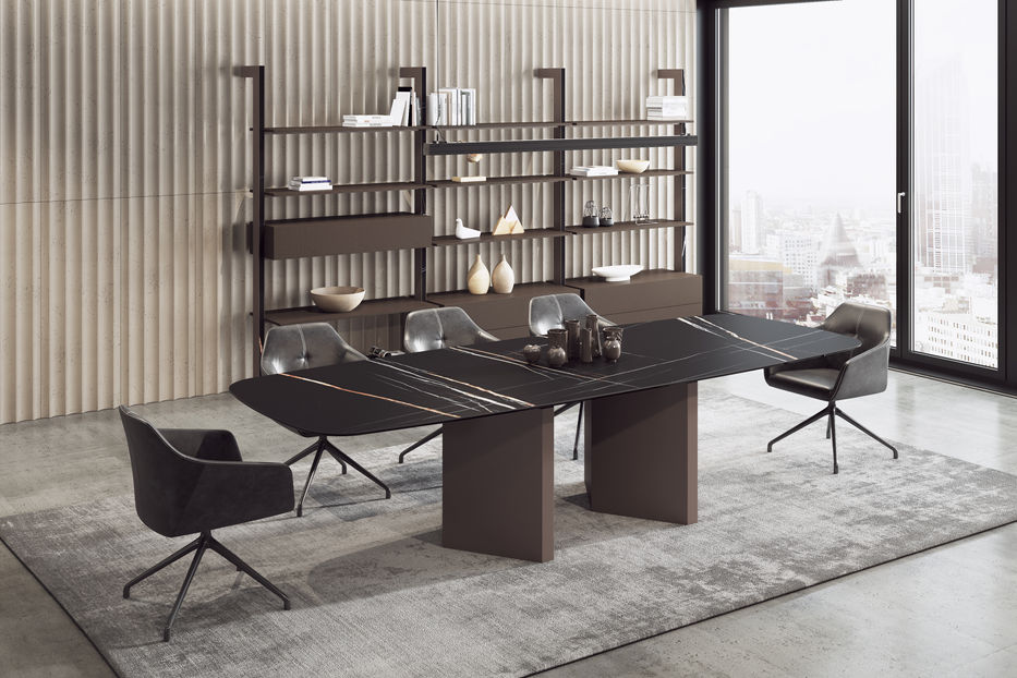 Pełna konfiguracji stołu. Możliwość zastosowania różnych materiałów blatu: spiek ceramiczny, drewno lub fornir. Bogaty wybór rozmiarów oraz kształt blatów.