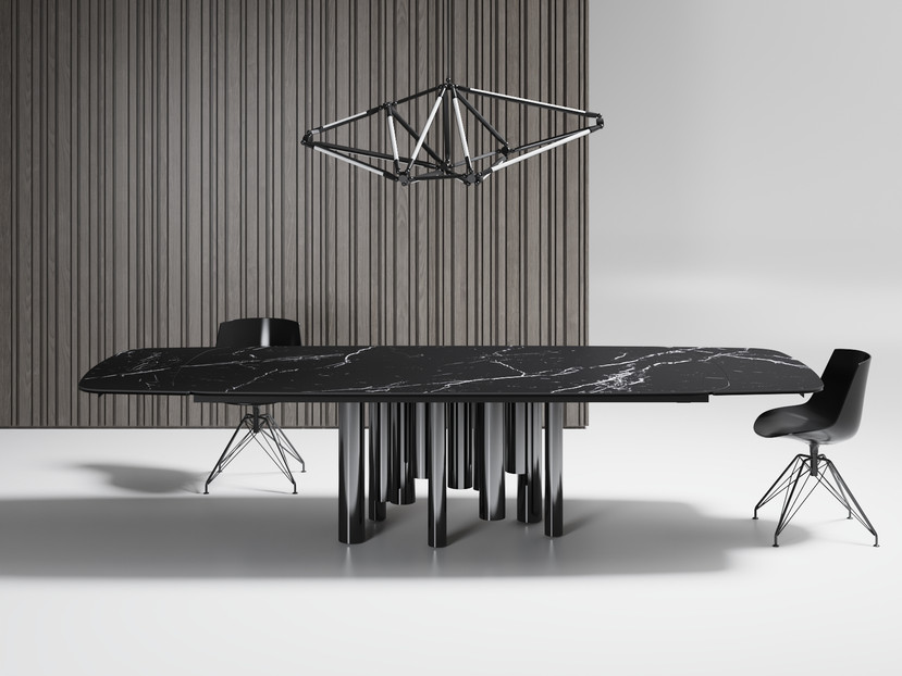 A collection of tables available in standard and extendable versions. Possibility to choose several dozen types of sintered, wooden or veneered countertops.